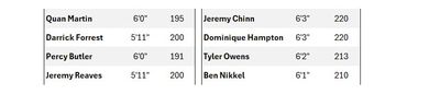 For consistency, I have given all the players’ height and weight stats as listed on the team website, which may vary from Combine measurements or other sources, but based on the numbers shown, it seems clear that the coaching staff has a prototypical height/weight target in mind. All three players (Chinn, Hampton, Owens) are listed at 6’2” or 6’3”, and weigh 213 or 220 pounds.