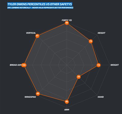 Clearly, the coaches are looking for highly athletic players as well. I shared Tyler Owen’s RAS card and spider chart above, and, while his testing was a less complete than that of many prospects, there’s enough there to show that he has elite traits.