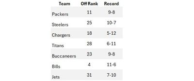 In general, these cheaper 2024 offenses weren’t highly ranked in 2023. Only the Bills were in the top-10 offenses, and the Packers were the only other team in the top half of the league. The Bills and the Steelers are the only teams with double-digit wins.