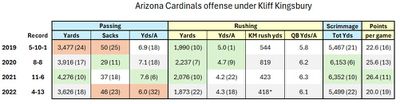 My first comment would be that 2019, Kyler Murray’s rookie season, and 2022, a season when the wheels fell off and Kyler Murray played in only 11 games, are the ‘outliers’ in this small sample. Personally, I will choose to focus on the two most successful seasons of 2020 and 2021 in trying to figure out what style of offense from his past NFL experience Kingsbury is likely to try to emulate.