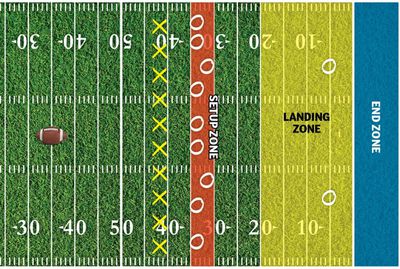 - The ball comes down in the landing zone (between the goal line and the 20-yard line). In this case, the ball must be returned unless it bounces into or through the end zone. If it goes into the end zone, then the ball can be returned or downed. If downed or if the ball bounces from the landing zone through the back of the end zone, then the play is blown dead and the ball is spotted at the 20-yard line.