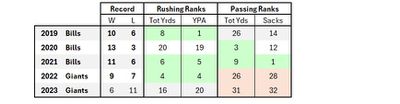 I decided to look at his 5 seasons as OL coach, which conveniently happen to have been with just 2 teams over consecutive seasons. Johnson was the offensive line coach for the Bills from 2019-21, and then with the Giants in ‘22 & ‘23. He didn’t get fired in between; when Brian Daboll earned a promotion from offensive coordinator of the Bills to head coach of the Giants, he brought Johnson with him.