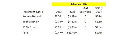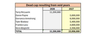The 2024 cap savings that results from the use of void years on these 4 contracts amounts to about $6.04m. The team will enjoy the same “savings” against the 2025 and 2026 caps.