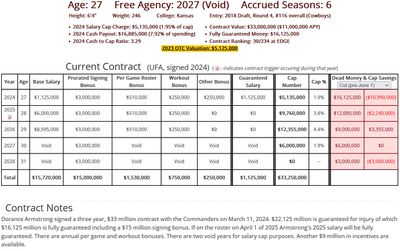 As you can see, Armstrong’s contract has $6m in cap space shoved into two void years (2027 & 2028). Unless he is re-signed to an extension, this $6m will become “dead cap” in the 2027 season. The use of these two void years allowed the Commanders to reduce the 2024 cap hit by $2m because the $6m in the void years would have otherwise been evenly split between 2024, 2025, and 2026 (so, $2m per year).