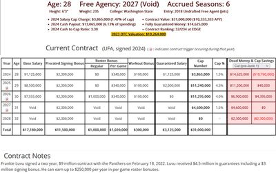 Frankie Luvu will contribute $4.6m dead cap in 2027 (absent an extension); the use of void years with this contract reduced the 2024 cap hit by about $1.53m.