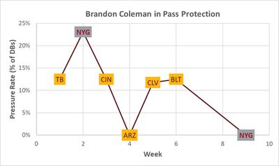 Aside from the Cardinals game, Coleman has been allowing pressures on over 10% of pass rush snaps, which is around twice the average rate for starting LTs, but not outrageous for a rookie. The following graph illustrates Coleman’s performance in pass protection in the 7 games in which he has taken 8 or more pass block reps.