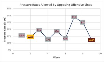 In the rematch, the Commanders were without primary starting left tackle Cornelius, who was sidelined with an ankle injury. It was time for Brandon Coleman to play his first full game as the starter. Up to Week 8, Coleman had been alternating series with Lucas. While he had shown enough promise to earn significant playing time, he had been allowing pressure on 10.9% of pass blocking snaps, which is about twice the rate of mid-range starting LT, and more than twice the rate of Lucas (4.7%) who is having his best professional season.
