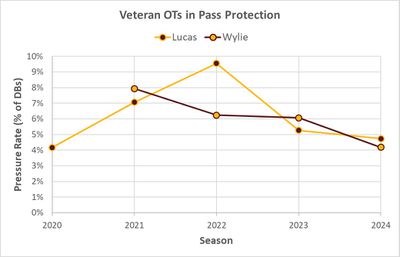 The following graph shows the veteran OTs’ performance in pass protection since Lucas signed with Washington in 2020. Wylie started out at RG with the Chiefs and switched to RT full time in 2021.