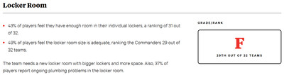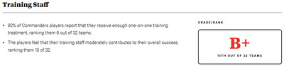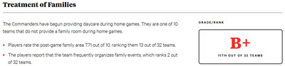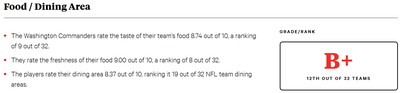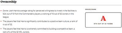 This year’s survey saw a significant jump in the team’s overall ranking, going from dead last to 11th in the league. Washington was also 32nd the previous year as the previous owner’s final days dwindled down and the sale was in the works. The Josh Harris ownership group has invested money in the team’s facilities to improve them for the players and staff, but the real improvements are down the road when a new stadium, and other team facilities are built.