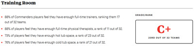 After finishing last for two consecutive years, the Washington Commanders surged to 11th overall. The Commanders’ improved rating reflects how meaningful improvements to players’ daily experience can be achieved, even with physical facility limitations.