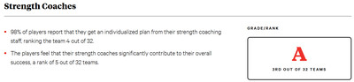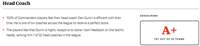 Washington saw major improvements in treatment of families and training staff, with both improving to a B+ from an F- and F respectively. Team travel improved from an F to an A, and you could see some extra comfort in travel throughout the season through the team’s social media accounts. Dan Quinn was the highest-graded coach in the league with an A+, and ownership improved from a B to an A.