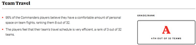 Key to the turnaround was the hiring of Dan Quinn, who finished the season as the No. 1 ranked head coach across the league. Additionally, the team invested in the food program, improving their grade from a D+ to a B+. They also increased the frequency of family events and began providing daycare during home games which boosted their grade for treatment of families, rising from an F- to a B+. The improvement in team travel is notable, with 95% of players reporting comfortable personal space on flights, up from just 50% last year.