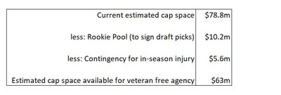 Available cap space is a moving target. When the team signs players to future contracts next week, the estimated available cap will fall. When players are released or traded before the start of the new league year in mid-March, the estimated available cap space will change again — probably increasing.