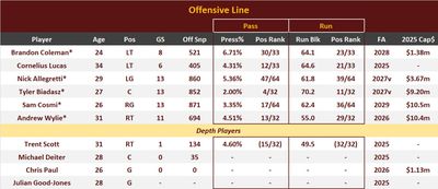 Tables show age next season. 2024 Games Started (GS) and snap counts are shown in with annotations when players missed significant time on IR. Player ranks according to key productivity stats for their positions are shown in the table. Where a player did not meet the playing time requirement for ranking, their equivalent position rank is shown in parentheses. The tables show the year a player hits free agency, with annotations to indicate a fifth-year option (+) or void years in their contract(v).