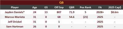 Marcus Mariota – Bridge Player: Mariota filled in for an injured Daniels against Carolina without the offense missing a beat. At age 31, he should have a few years left in the tank and represents good value on his current cap figure of $6M. He would be worth re-signing on a similar contract, if the Commanders don’t go younger at backup QB in the offseason.