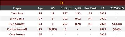 Zach Ertz – Replacement Level: Ertz has provided good value for the Commanders as a reliable second target for Jayden Daniels on a one-year, $3 million contract. He has caught 58.7% of targets for 501 yds, 29 first downs and 4 TDs. But at 34 years old in 2025, he is playing on borrowed time. In 2024, he was the 29th most productive receiving TE, as judged by Y/RR, among 45 TEs with a minimum of 25 targets. The Commanders need another playmaker on offense, and TE is a position worth focusing on.