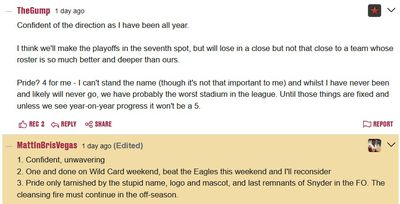 It’s possible to feel good about the team, yet not feel extremely optimistic about its playoff outlook. That’s what we explored in our final question in this week’s Reacts survey: your expectations about the Commanders and the upcoming playoffs.