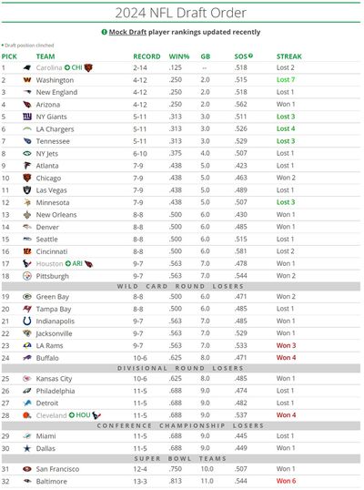 But you know what they say about any given Sunday. Kyler Murray and the Cardinals weren’t having any of it and dealt the Eagles their fourth loss in five games. The unexpected win dropped Arizona to fourth in the draft order, behind both Washington and the Patriots. Thanks to the Steelers’ road upset of the Seahawks (-4.5) and the Saints’ upset of the Bucs (-2.5), the Commanders maintained their SoS advantage over the Patriots and moved up to second place.