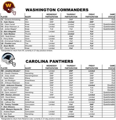 The Washington Commanders held their final full practice of the week today as they prepare for their home game against the Carolina Panthers on Sunday. Jonathan Allen and Javontae Jean-Baptiste were placed on IR, and Dorance Armstrong was also injured during Sunday’s loss to the Ravens. He will miss his first game of the season with a rib injury. Rookie safety Tyler Owens is the only other player ruled out.