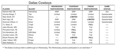 Washington had several players go down against the Falcons, including two offensive linemen. Tyler Biadasz left with an ankle injury and Cornelius Lucas suffered a groin injury. Both players are listed as doubtful and they likely won’t be able to play against the Cowboys. Andrew Wylie had a full practice today and should return at RT on Sunday.