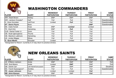 Marshon Lattimore will make his Washington Commanders debut, and he will be a starter against his former team. He has been a full participant in practice all week as he returns from a hamstring injury that kept him out of the last five games, including his final one with the Saints.