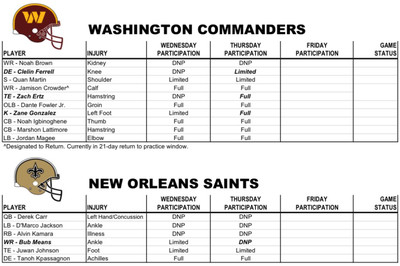 Washington’s kicker Zane Gonzalez was limited yesterday, and listed with a new injury to his left foot. He was a full participant in today’s practice and should be ready for the Saints on Sunday. Zach Ertz had a vet rest day, but is also listed with a hamstring injury.