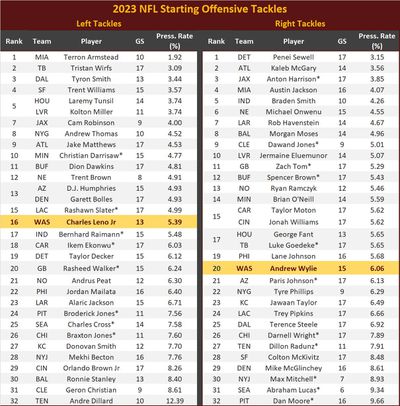 Neither of Washington’s 2023 starting OTs ranked in the bottom third of NFL starters in pass protection. The suggestion that they were amongst the worst pass blockers in the league is not supported by the facts.