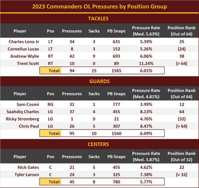 The Commanders quarterbacks experience the most pressure from the interior of the offensive line in 2023; and the interior blockers were the most deficient relative to standards for their positions on the offensive line. Interior offensive linemen are also much easier to replace in free agency and the draft than offensive tackles.